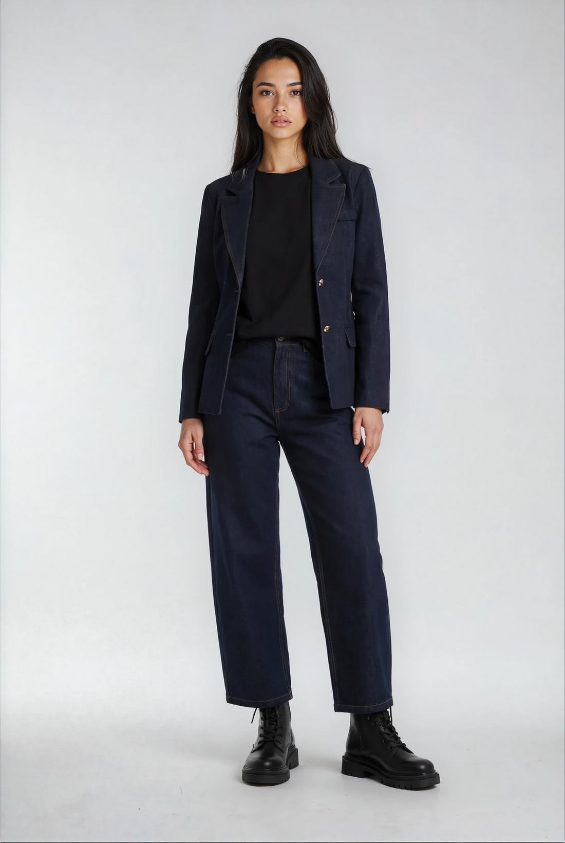 Säg hej till säsongens mest stilfulla set. En mörkblå denimkostym som fångar den perfekta...