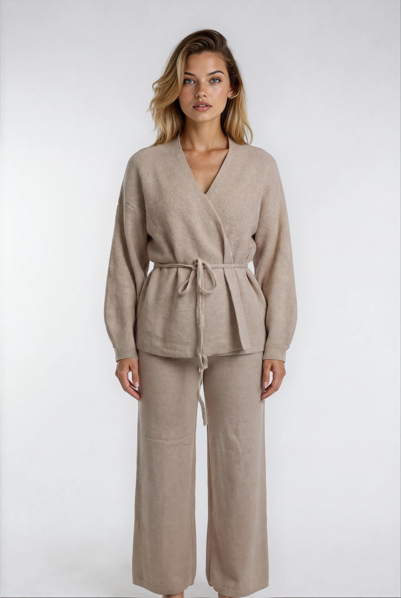Ge din garderob en stilfull uppdatering med vårt tvådelade set, ett perfekt val för dig som älskar bekväm elegans. Setet består av en mjukt sittande cardigan med knytband i midjan och matchande raka byxor som tillsammans skapar en avslappnat sofistikerad look.